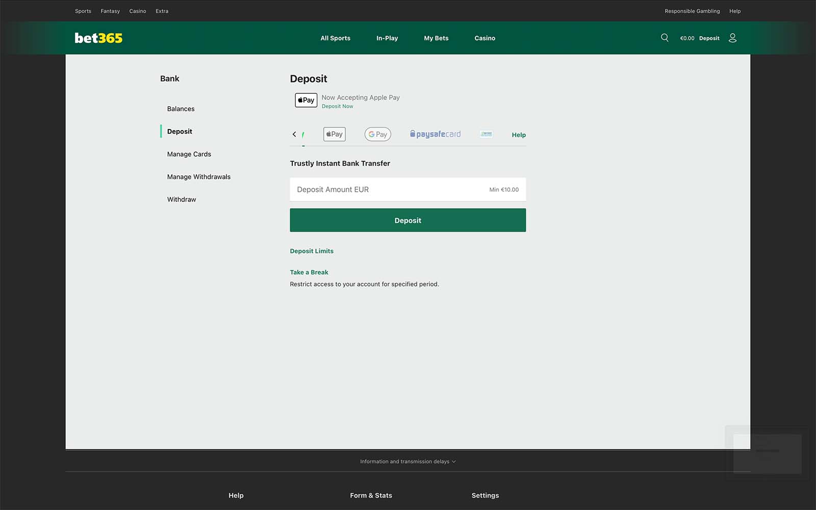 Käytettävissä olevat maksutavat painottuvat suoriin ja yleisesti tunnettuihin ratkaisuihin. Tarjolla ovat Trustly, Visa, MasterCard, Apple Pay, Google Pay sekä paysafecard. Sen sijaan nettilompakoita, kuten Skrill tai Neteller, ei ole valikoimassa, mikä poikkeaa monista muista kansainvälisistä vedonlyöntisivustoista. Linjaus on selvästi tietoinen ja sopii bet365:n yleiseen profiiliin: yksinkertaiset, hallitut maksutavat ilman ylimääräisiä välikerroksia.