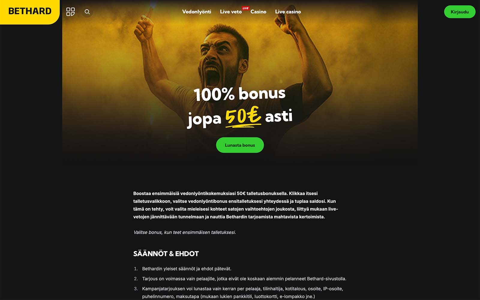 Bethard vedonlyöntibonuksen kierrätys on nykyään 15x (T+B), mikä on markkinoiden nykytasoon verrattuna melko tiukka kierrätys. Muut bonusehdot ovat selkeät ja sopusuhtaiset.