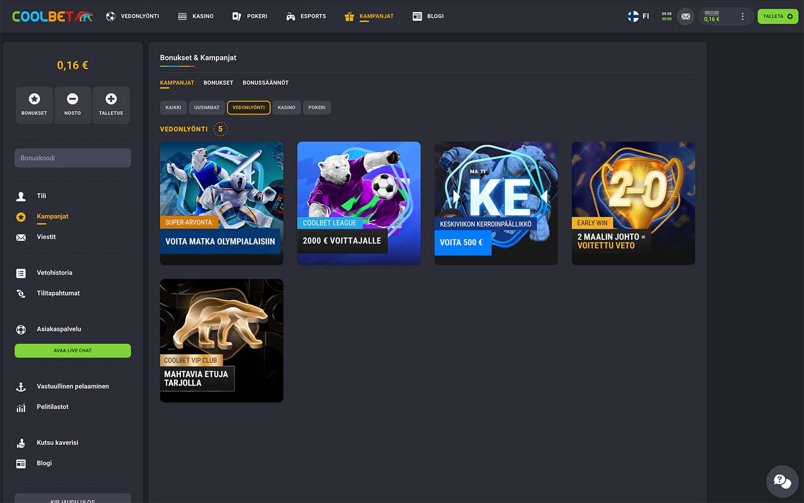 Lisäksi Coolbetin kampanjakalenteriin kuuluu esimerkiksi Keskiviikon kerroinpäällikkö, jossa viikon keskiviikkona suurimman voittavan kertoimen napannut pelaaja saa jopa 500 € ylimääräistä bonusrahaa. Kokonaisuutena Coolbetin kampanjatarjonta on markkinan aktiivisimpia ja persoonallisimpia, ja se tuo vedonlyöntiin pelillisyyttä, joka puuttuu monilta suuremmilta kilpailijoilta.