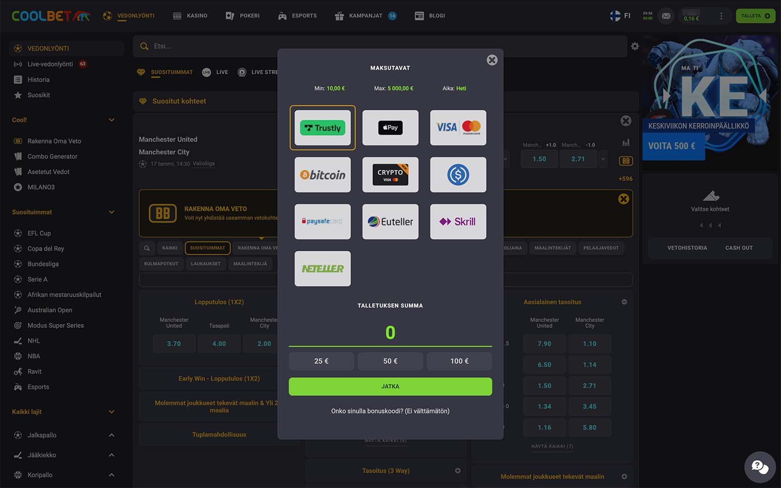 Maksutapojen valikoima on yksi Coolbetin vahvuuksista. Käytettävissä ovat Trustly ja Euteller pankkisiirtoihin, Visa ja MasterCard korttimaksuihin sekä nettilompakot Skrill ja Neteller. Lisäksi tarjolla ovat paysafecard ja jopa Bitcoin, mikä on edelleen harvinaista suurilla vedonlyöntisivustoilla. Kotiutukset käsitellään nopeasti, ja maksuliikenne toimii kokonaisuutena juuri sillä varmuudella, jota suomalaismyönteiseltä ja vakiintuneelta toimijalta voi odottaa.