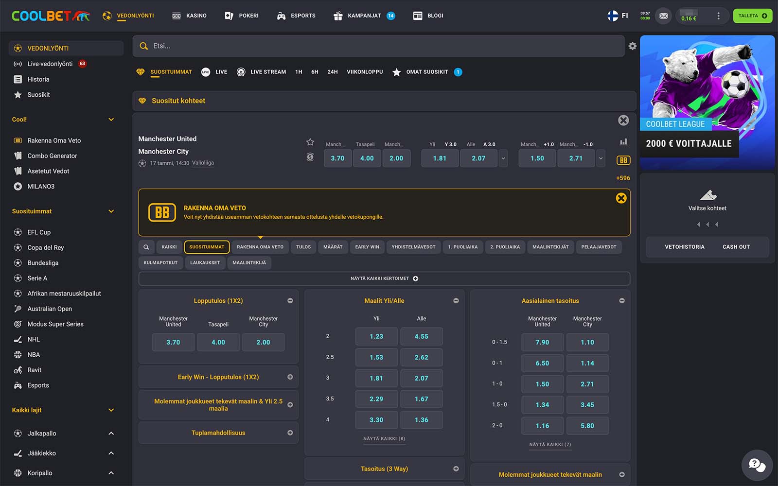 Coolbet tarjoaa kaikki keskeiset nykyaikaiset vedonlyöntiominaisuudet, kuten cash outin, bet builder -vedot ja live-vedonlyönnin, jotka on toteutettu selkeästi ja luotettavasti osaksi käyttöliittymää. Ominaisuudet eivät korosta itseään, vaan tukevat sujuvaa pelaamista ilman turhaa hässäkkää.