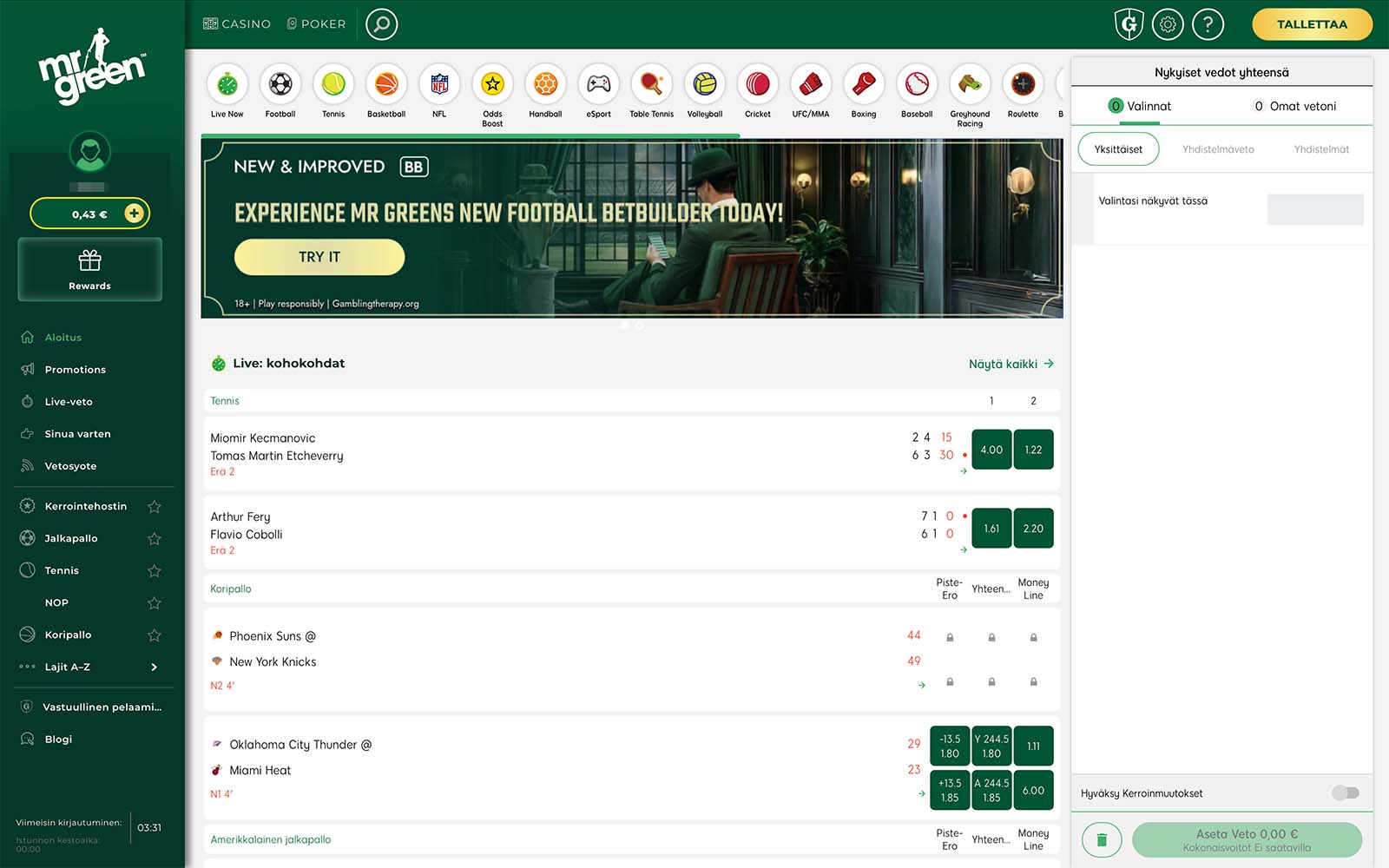 Kun uuteen vedonlyöntialustaan malttaa tutustua, myös käytettävyys asettuu hyvälle tasolle. Live-vedonlyönti toimii sujuvasti, sivusto reagoi nopeasti ja kokonaiskokemus on tasainen – ei enää vanhan Mr Greenin persoonallinen erikoisuus, vaan moderni ja varma yleisratkaisu.