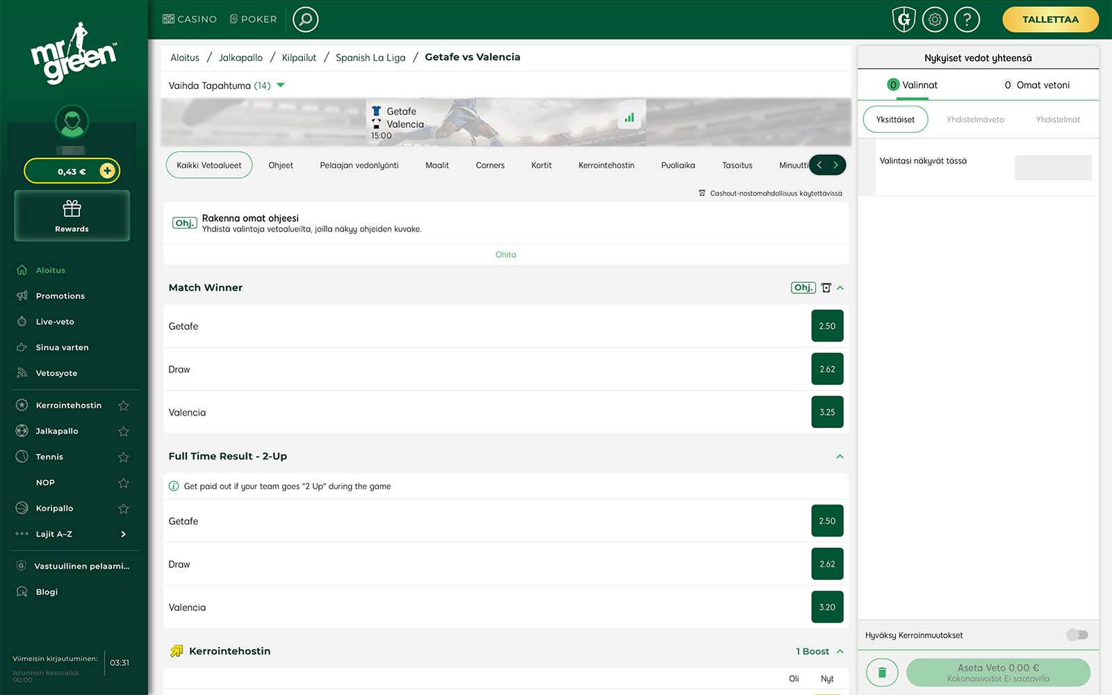 Mr Greenin vedonlyönnin tervetulobonus on rakennettu matalan kynnyksen idealla. Uutena asiakkaana talletat vähintään 10 euroa bonuskoodilla MRSPORT, asetat vähintään 10 € vedon minimikertoimella 1,80 ja saat vastineeksi 2 × 10 € live-ilmaisvedot ilman kierrätysvaatimusta. Etu on suoraviivainen: ei monimutkaisia ehtoja, ei pitkää odottelua, vaan palkinto, jonka voi käyttää heti oikeissa live-tilanteissa.