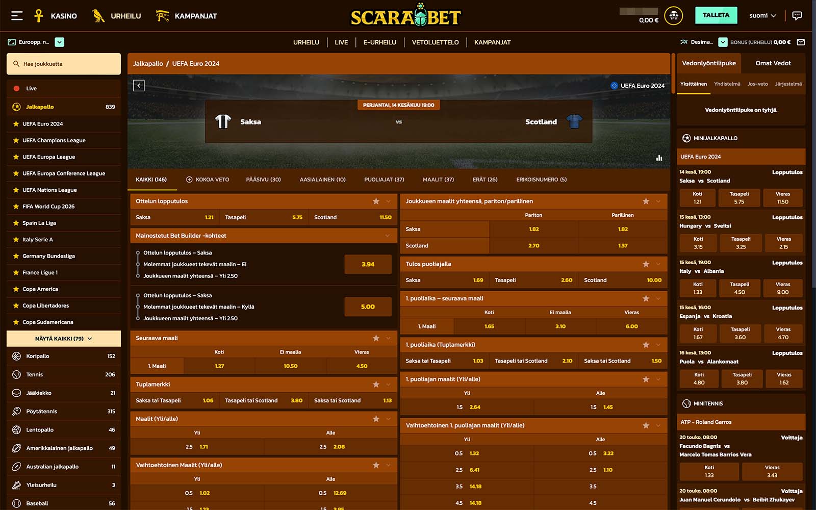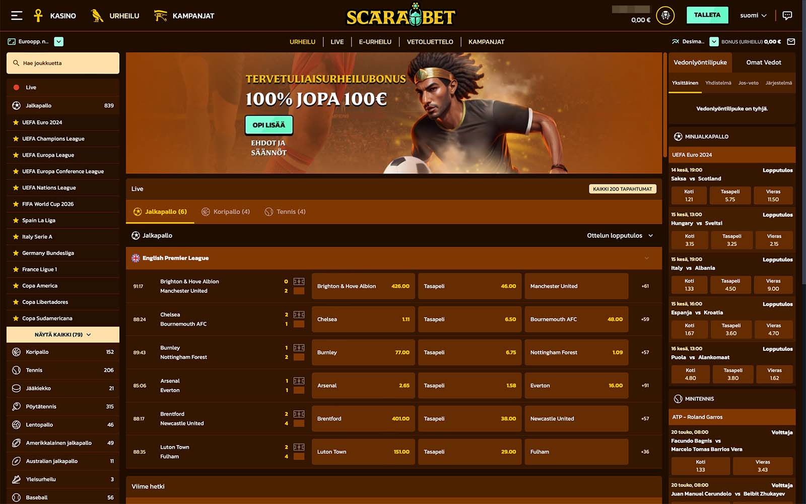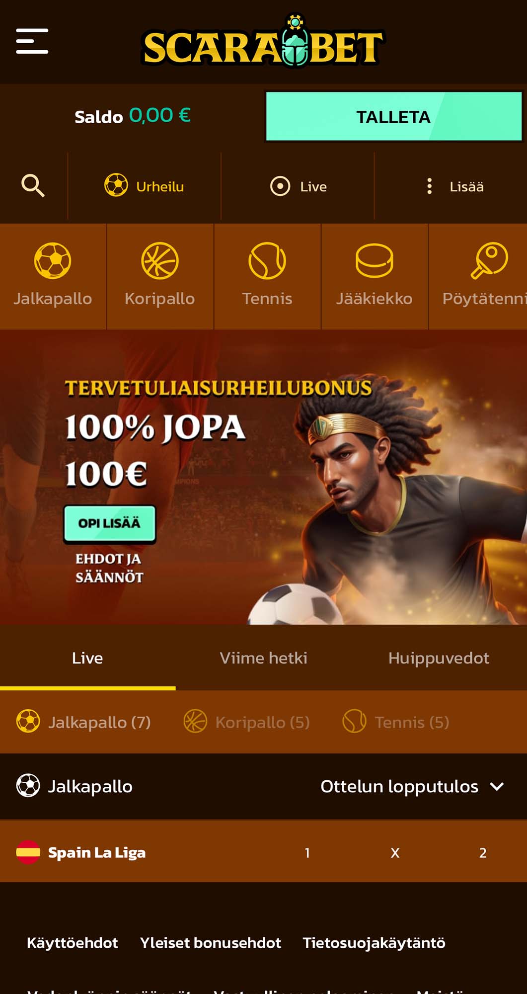 Scarabetillä on käytössä vaihtoehtoisen tervetuliaisbonuksen malli. Jos pelaat tyypillisesti hieman isommalla pelikassalla, Tipsimaatti suosittelee valinnaksi talletusbonusta, koska sen rahallinen arvo on suurempi. Kyseessä on ensitalletuksen tuplaus 100 € asti, jonka kierrätys on 5x (T+B). Sen saa käyttöön 25 € minimitalletuksella. Kierrätys etenee vain jalkapallossa, jääkiekossa, koripallossa ja tenniksessä, eikä tasoitus- ja DNB-vetoja oteta huomioon.