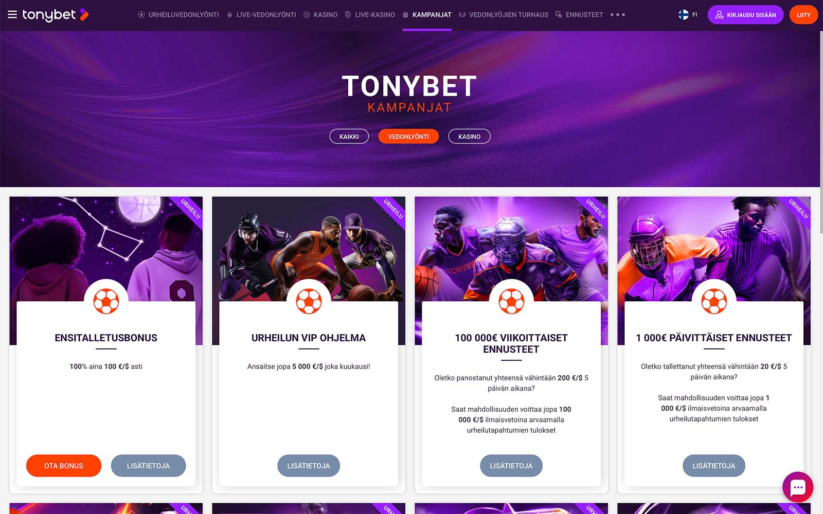 Ei. TonyBetin kampanjat toimivat ilman koodeja, joten sinun tarvitsee ainoastaan painaa kampanjasivun painiketta.
